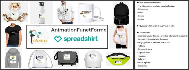 Pour ceux qui participent aux séances, n'hésitez pas à nous soutenir en achetant des articles "Fun & Forme", ce qui permettra de compenser l'achat d'équipement sportif et de petit matériel, la préparation des fiches séances, les consommables, l'achat de musique en ligne pour les playlists...